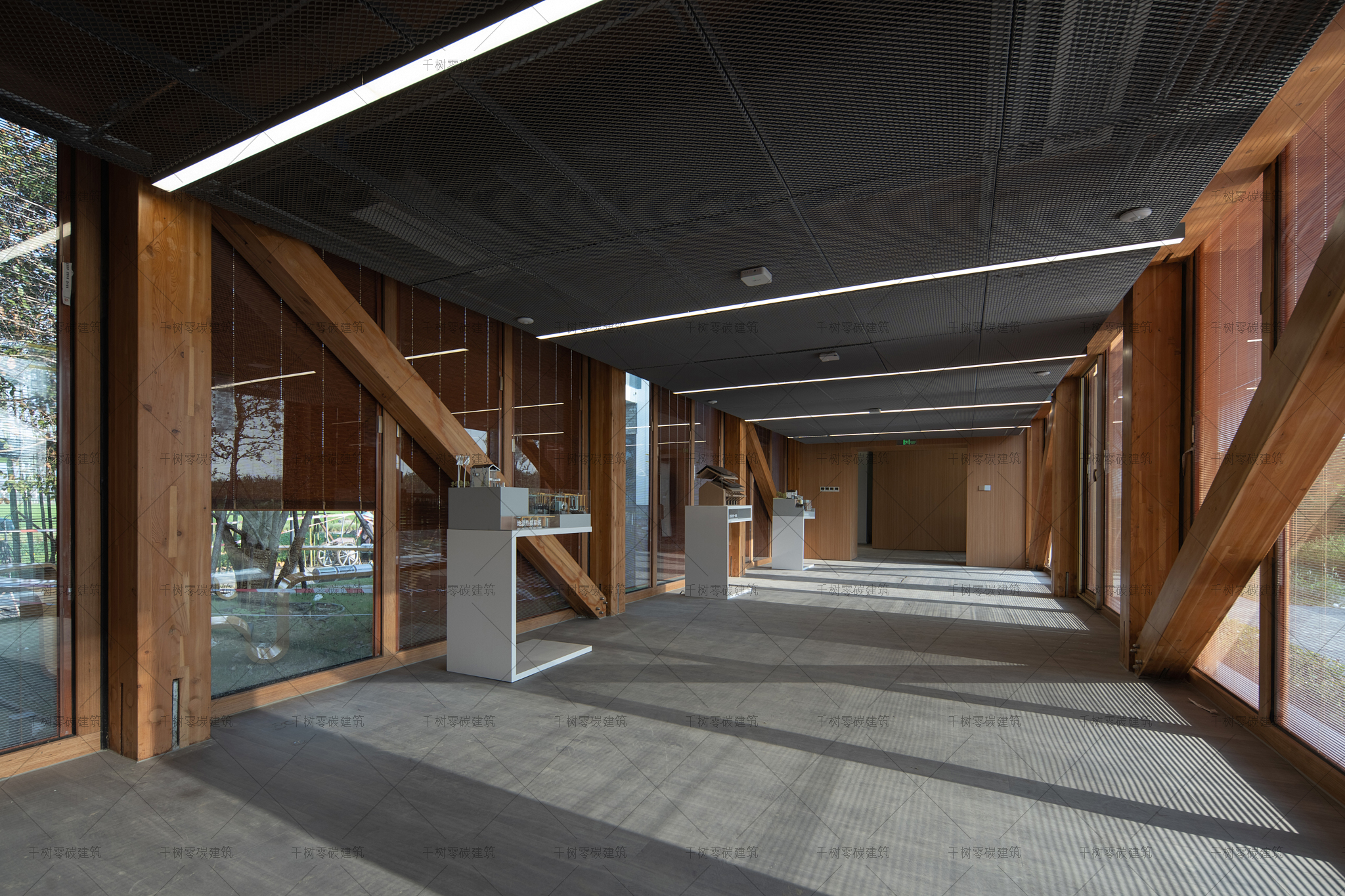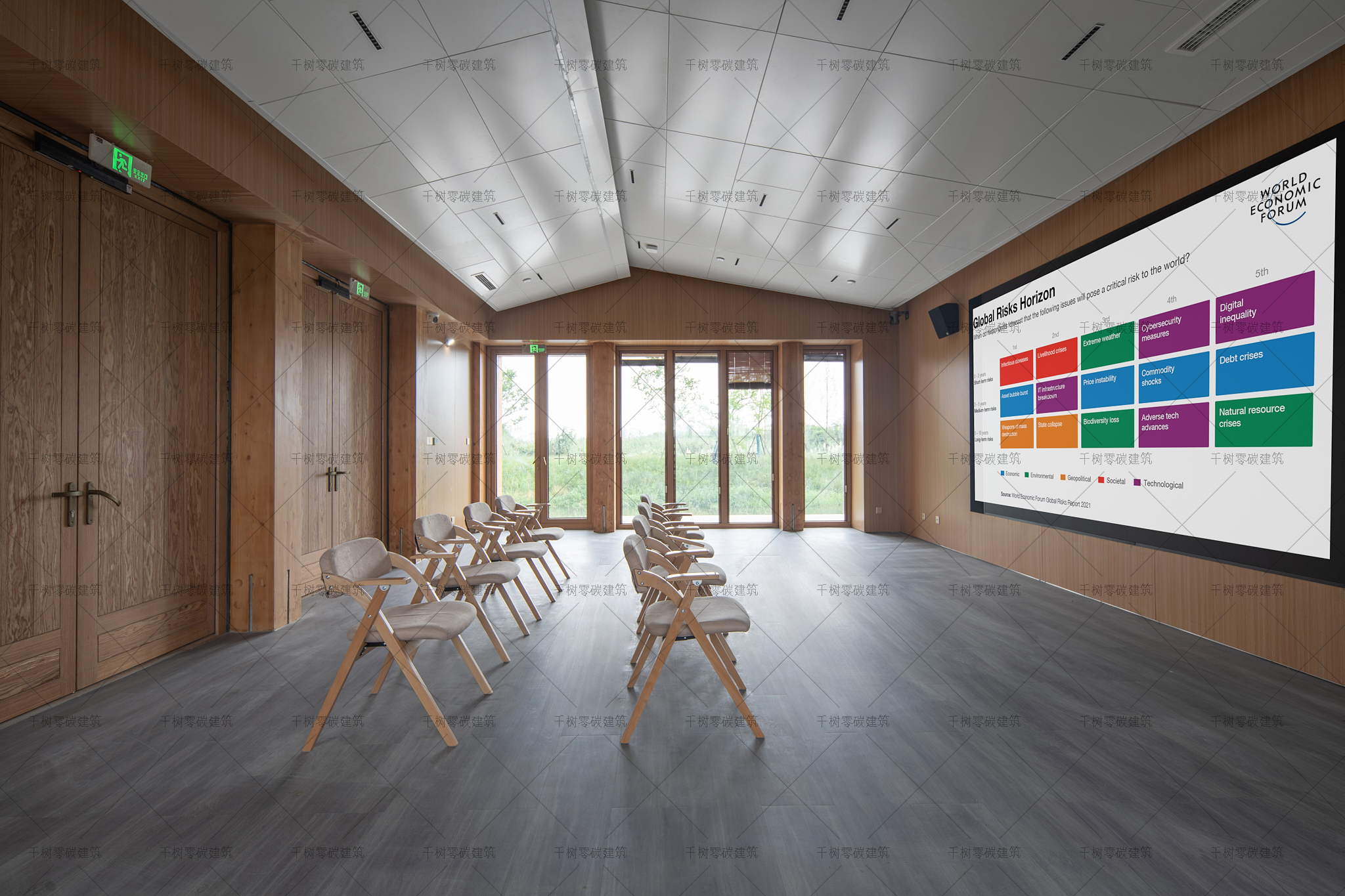 報告廳木屋和展示中心木屋墻面采用隔氣膜+內(nèi)外雙層保溫(內(nèi)保溫184mm厚,外保溫70mm厚)+CLT正交膠合木飾面板,屋面采用隔氣膜+保溫(屋面保溫235mm厚)+光伏瓦的圍護(hù)結(jié)構(gòu),門窗采用被動式節(jié)能阻燃木門窗(內(nèi)置遮陽百葉),加上高能效的技術(shù)設(shè)備:地源熱泵系統(tǒng)、風(fēng)力發(fā)電系統(tǒng)、建筑光伏一體化系統(tǒng)、光儲直柔系統(tǒng)、熱回收系統(tǒng),通過可視化的智慧運(yùn)維管理平臺高效監(jiān)管、智慧運(yùn)算,綜合管控與整治,最終實現(xiàn)了零碳建筑的目標(biāo)。
