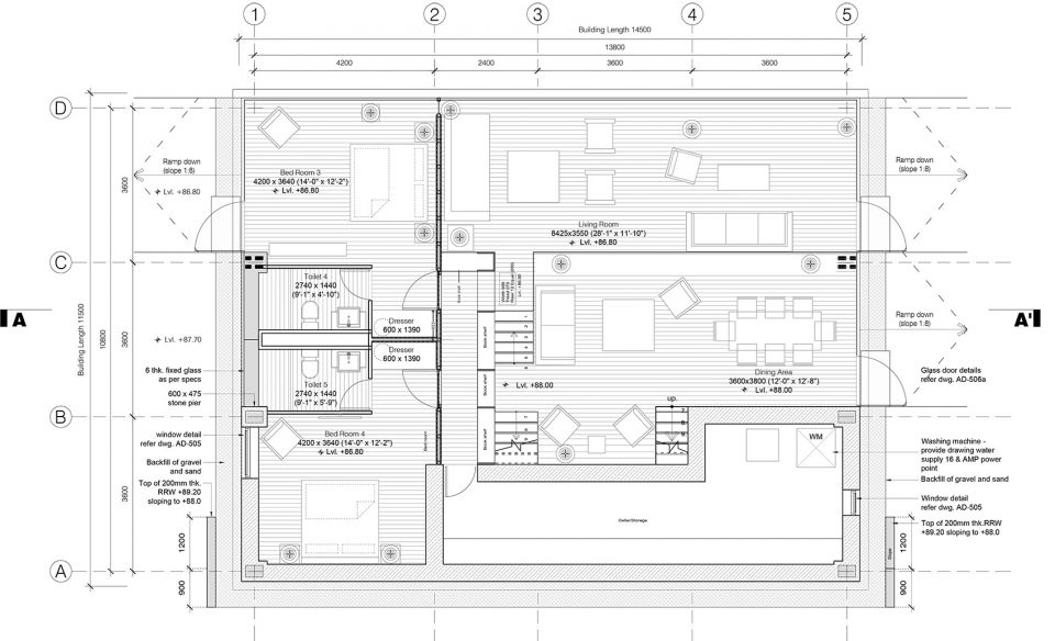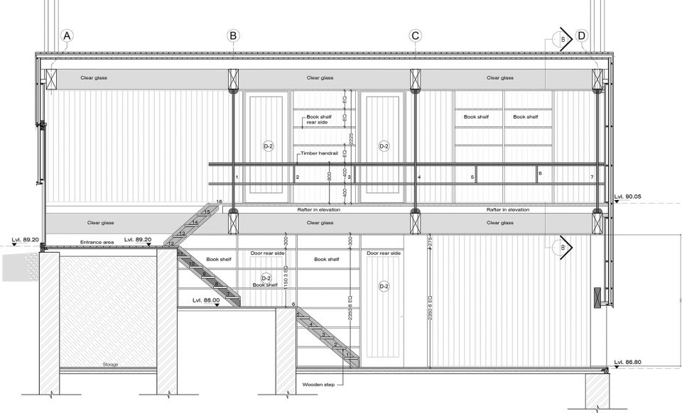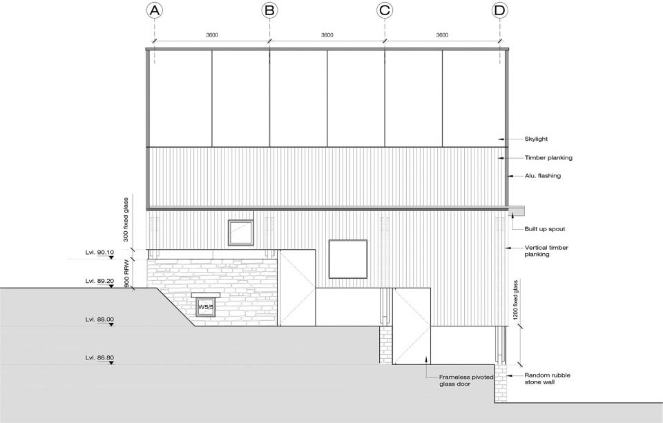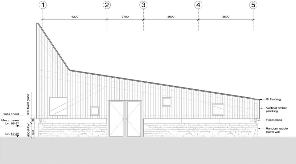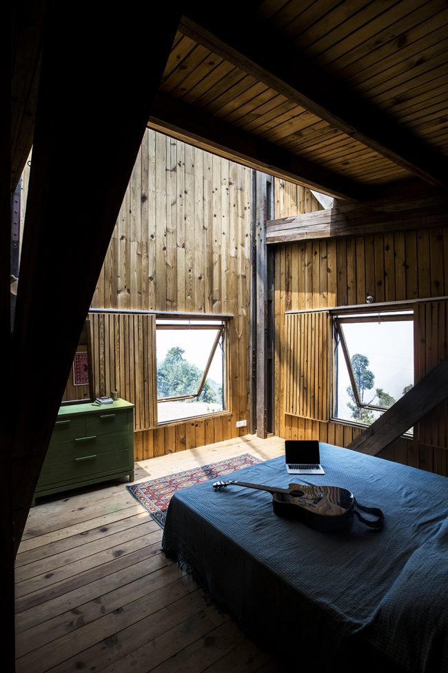 空間由三個不同的層次組成,每一個都大約占用14.5米x3.6 m的自然地形,外立面的連續(xù)橫窗使得周圍的果園和Almora鎮(zhèn)的壯觀景色一覽無余。這個開窗像是一個裂縫,成為現(xiàn)場挖出的裸露的干石墻基地和當(dāng)?shù)孛麨閠hun木材包覆之間的過渡。