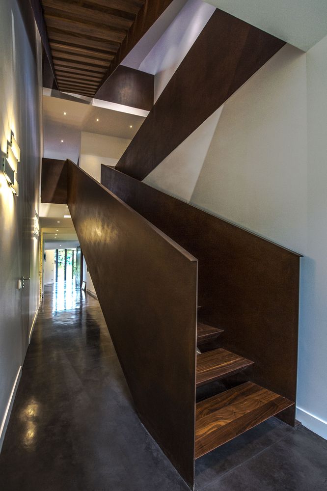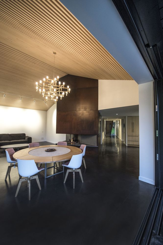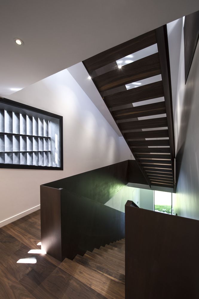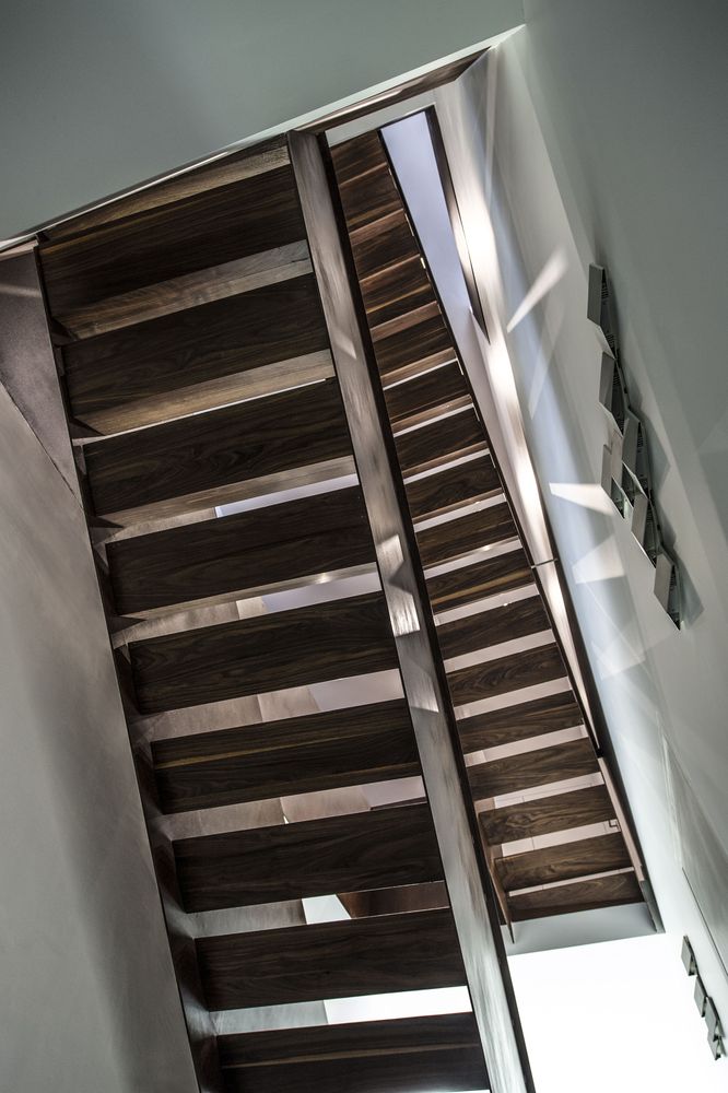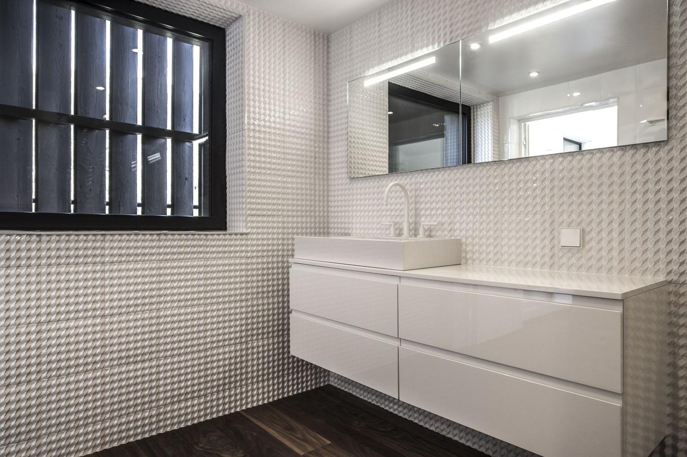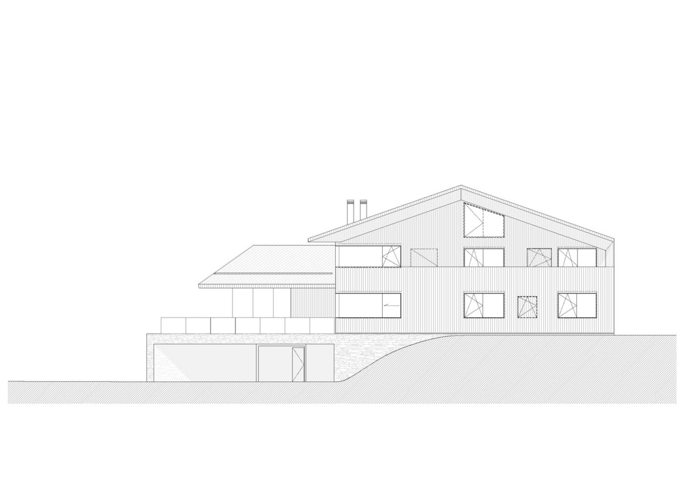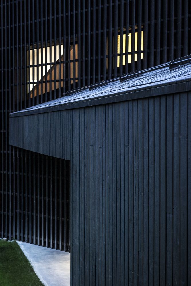 落葉松木板用于建筑主要外墻的百葉窗覆層系統(tǒng),以便保證地面層和2層的浴室擁有良好的視野。 用于外墻的落葉松木經(jīng)過特殊的加熱處理,以便保持顏色的持久并防止煙灰的附著。