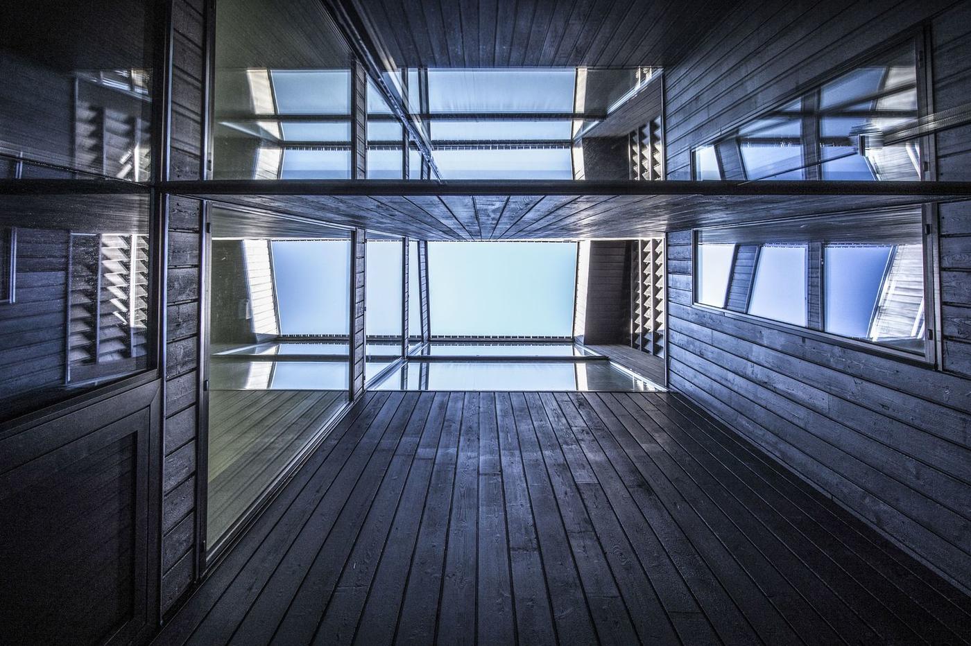 這個(gè)項(xiàng)目圍繞兩個(gè)主題進(jìn)行設(shè)計(jì):視野以及追求最大限度的太陽(yáng)直射光。日影儀可以分析太陽(yáng)對(duì)場(chǎng)地和建筑的影響。項(xiàng)目在現(xiàn)實(shí)場(chǎng)地的三維建模讓我們能夠精確地了解將會(huì)進(jìn)入小屋的自然光強(qiáng)度,并從室內(nèi)感受勃朗峰的壯麗景觀。采用混合隔熱設(shè)計(jì),房屋全部采用混凝土結(jié)構(gòu)和落葉松木地板覆層系統(tǒng)。