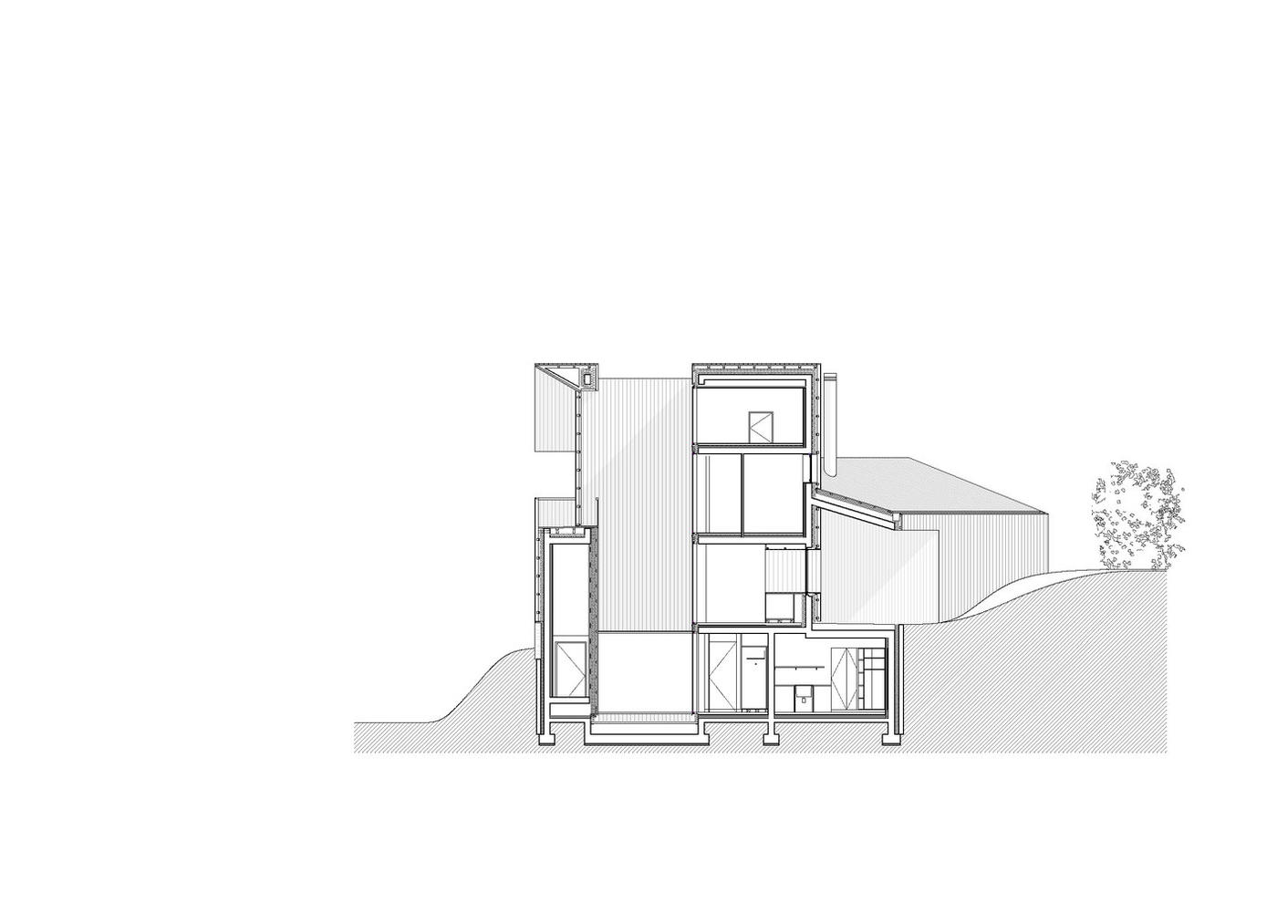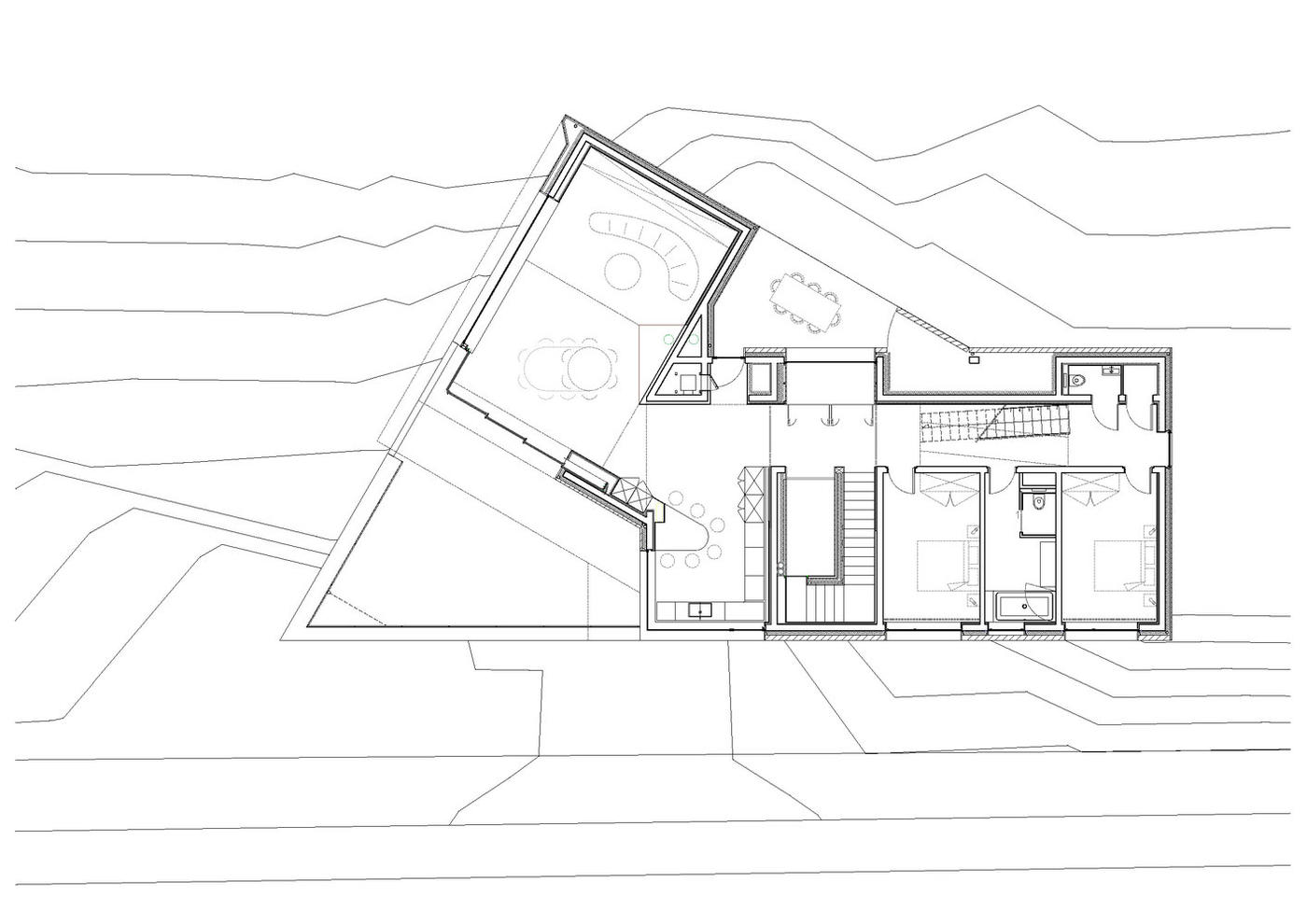 這個(gè)項(xiàng)目建在自然環(huán)境之中,石頭基地的頂部為一個(gè)小木屋。 基地設(shè)有技術(shù)功能房和一個(gè)車庫(kù)。這個(gè)項(xiàng)目的完成時(shí)間只有短短9個(gè)月。