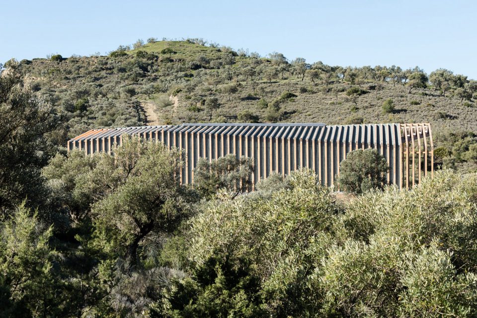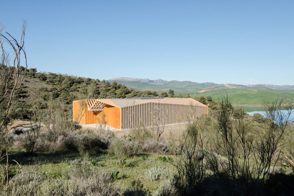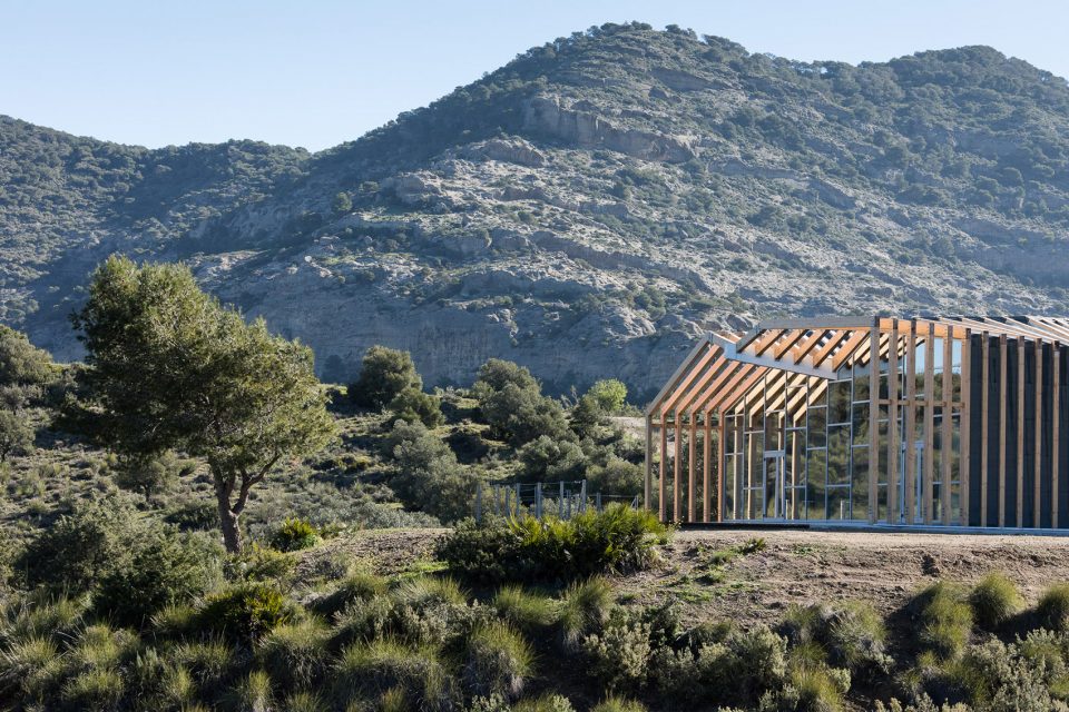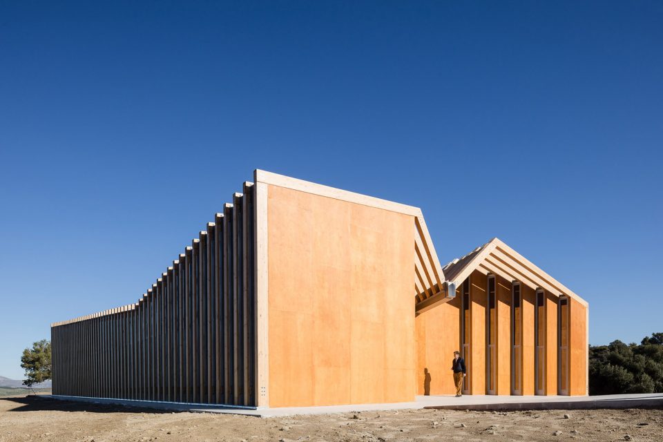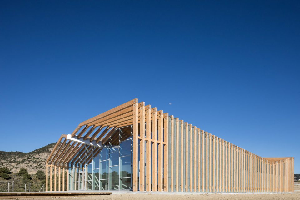 平行布置的木質(zhì)外框架形成了該建筑的主要特征,頂部的扭曲打破了嚴謹又富有秩序性的建筑外觀,創(chuàng)造了視覺的沖擊。外立面木結(jié)構(gòu)的夾縫間由木板加以防水涂層覆蓋,而末端縫隙則采用石板覆蓋。這種設計方式暗喻了峽谷的形成和對古道的解讀。建筑依靠光電板實現(xiàn)全部能源自給自足,并依靠Canadian well實現(xiàn)室內(nèi)通風。