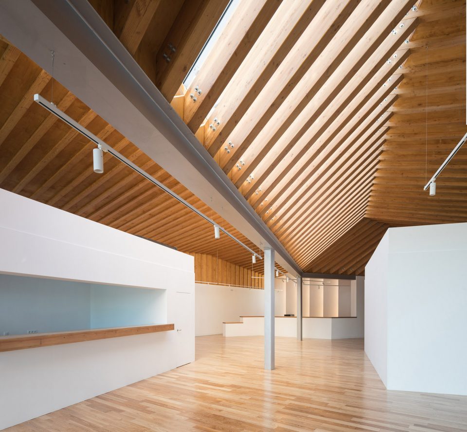 間接的自然光線和天窗光線交替穿梭進昏暗的室內(nèi)空間,形成獨特的內(nèi)部空間表達。交錯的光亮將人的視線逐漸引入室外的湖泊景觀。隨光照的變化,空間景象展現(xiàn)出可逆的內(nèi)部環(huán)境。交替的木結(jié)構(gòu)和鋼結(jié)構(gòu)與環(huán)境融為一體,建筑也與周圍自然環(huán)境和諧共處。