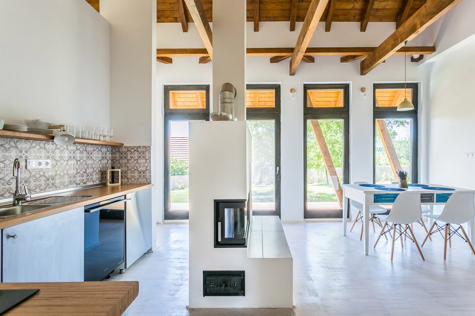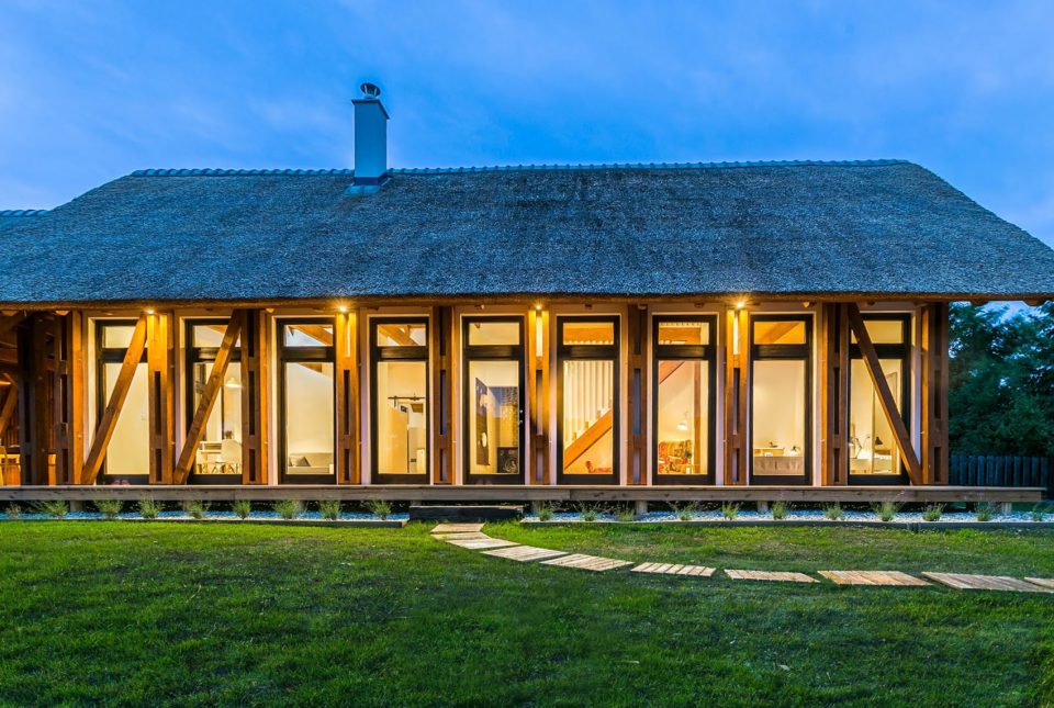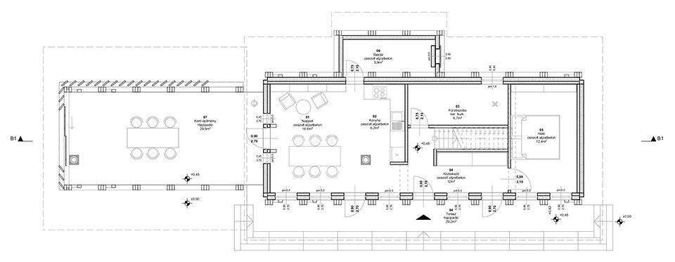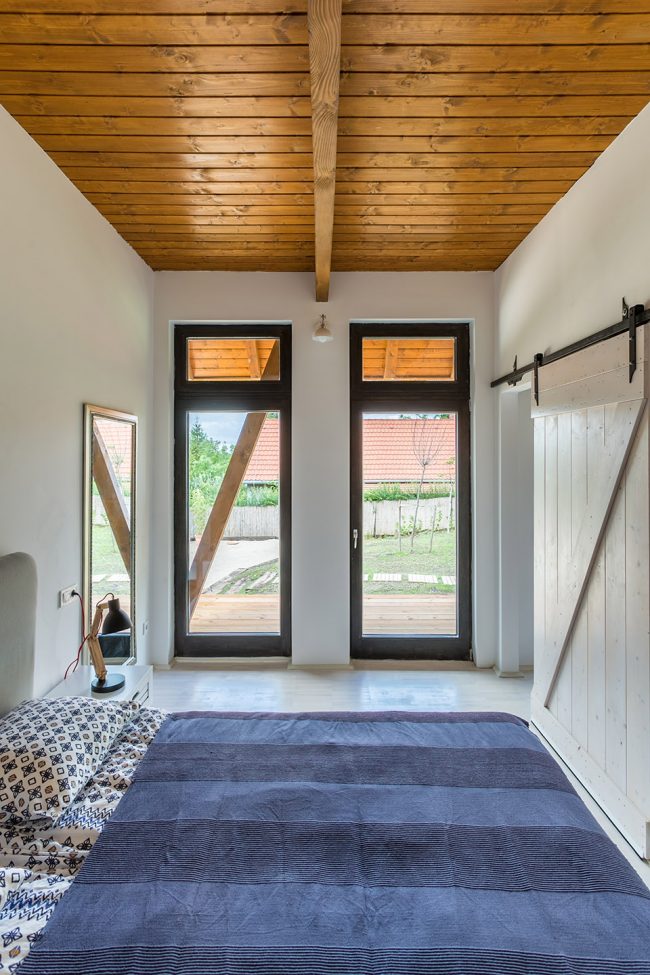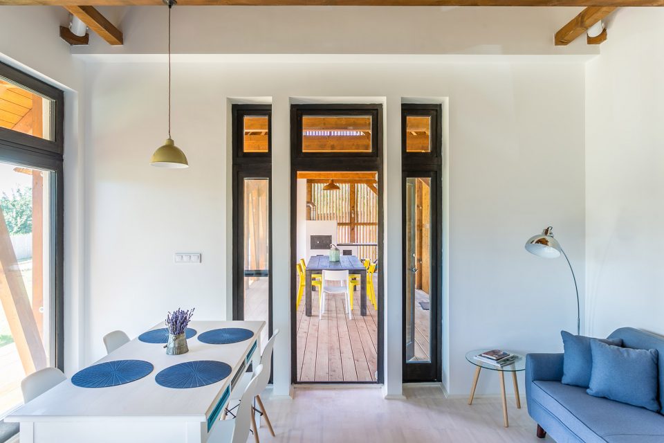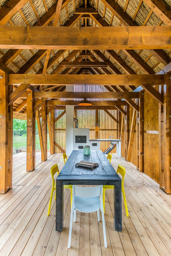 建筑采用自承重木結(jié)構(gòu),隔離墻放置在柱子之后。除外部露臺不設隔墻外,其自身結(jié)構(gòu)與建筑主體結(jié)構(gòu)并無二異。建筑設計充分遵循業(yè)主的設計要求,同時嚴格遵守Balaton丘陵地區(qū)的建設標準。