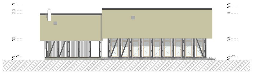 被強化的建筑結(jié)構(gòu)進一步實現(xiàn)了度假屋的設計理念。以1.4米間隔成對出現(xiàn)的結(jié)構(gòu)柱式形成了建筑的主立面。玻璃門窗沿立面鋪設,賦予了陽光足量的穿行空間,讓人的生活與自然環(huán)境充分接觸。