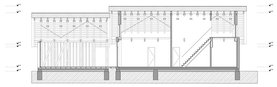該建筑的形態(tài)設計和材料選擇均充分尊重了場地的周圍環(huán)境。設計師將傳統(tǒng)材料運用與當代設計手法之中,裸露可見的承重結(jié)構(gòu)形成富有韻律感的外立面,讓建筑彰顯與眾不同之處。