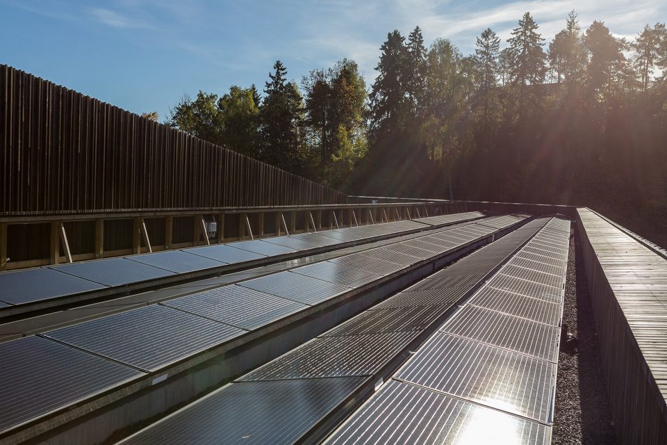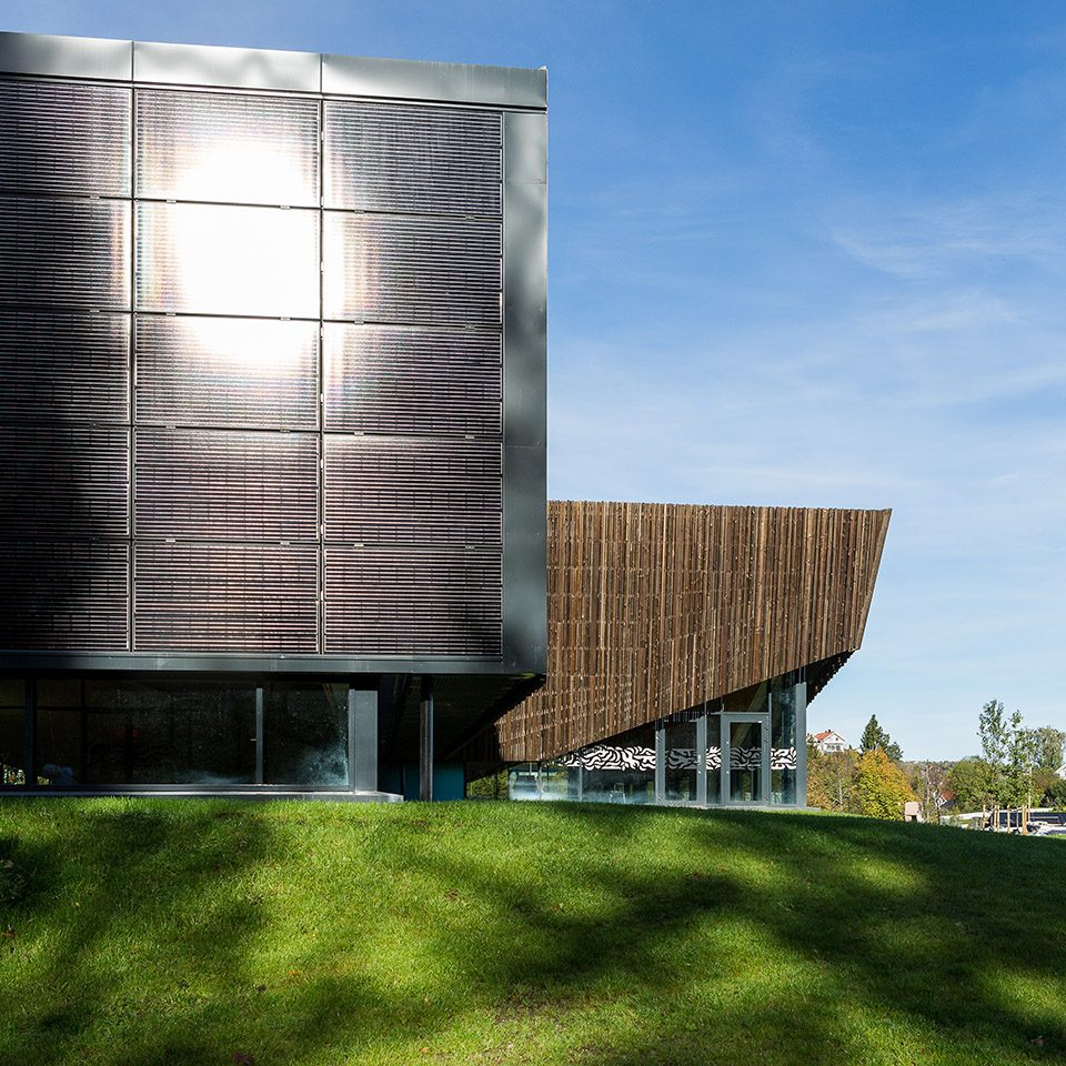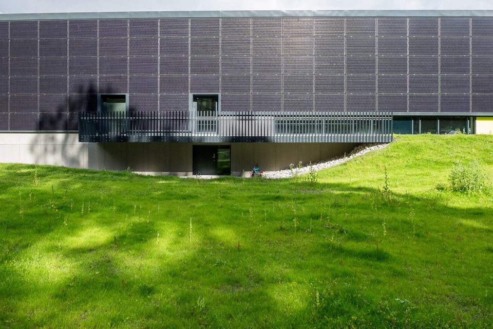 被動(dòng)式的設(shè)計(jì)使建筑在能源利用方面變得更加高效,具體體現(xiàn)在建造方法、隔熱層和建筑形式上。除此之外,設(shè)計(jì)還強(qiáng)調(diào)了能源的再利用,其中以熱水供暖最為突出。650平方米的太陽(yáng)能板和場(chǎng)地中的15個(gè)地?zé)峋餐瑢?lái)自基巖的熱能輸送給建筑,在夏季還能將多余的熱量傳遞到地表下方。