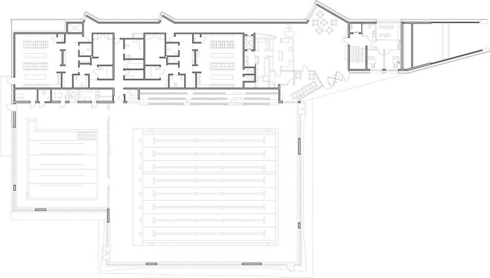 ▼主入口、接待處、更衣室和游泳池皆位于建筑的主樓層