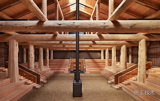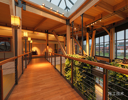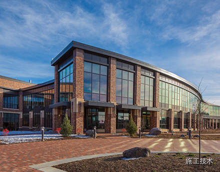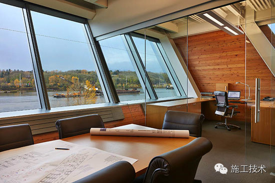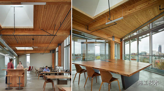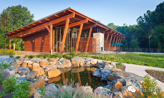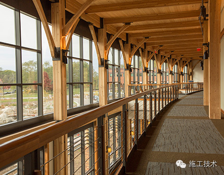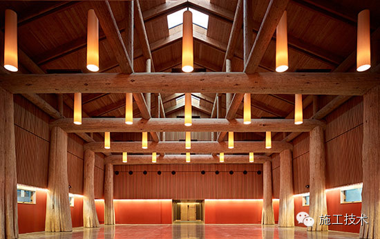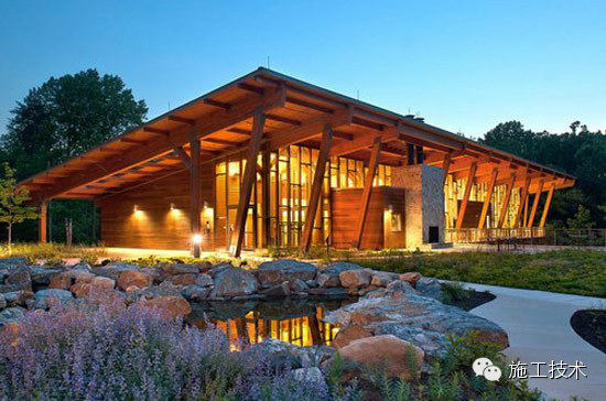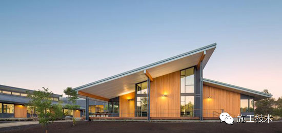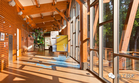 建筑物的桁架為膠合層壓板,從而優(yōu)化了這種可再生資源的結構價值。膠合板消耗能源少于鋼筋混凝土或鋼材,可用于更長的時間跨度,可承受重負荷,并且擁有復雜 的形狀。該建筑通過了LEED環(huán)境保護認證,包括一套可再生的膠合板結構系、節(jié)水管道夾具、利用可回收的當地材料、室內擁有豐富的自然光線以及高效的機械 系統(tǒng)、照明和外表皮。
