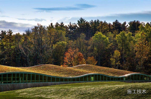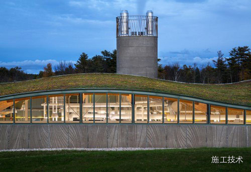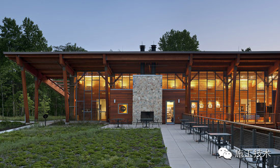 這個總面積達16500平方英尺的建筑屋頂由植被覆蓋而成,與周圍植物的顏色一致,有利于建筑物與自然風光相互協(xié)調。從某些角度,建筑幾乎消失于人們的視野 之中。當地豐富的可再生建筑材料在整個建筑框架、桁架、欄桿、單板和木材復合板中都得到了充分應用。欄桿是在當地收割、研磨、烘干后進行再裝配的。