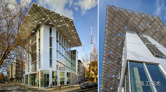 該建筑通過各種不同的系統(tǒng)達到以下這些目標,如一個高性能的建筑圍護結構;一個旨在優(yōu)化自然光的布局,估計有82%的中心空間將利用自然光采光。仔細與租戶 協(xié)調,通過使用高效率的顯示器、復印機、筆記本電腦、零客戶端和基于云的服務器,以減少他們約75%的“插頭負載”。26孔、400英尺深的地源熱泵空調 系統(tǒng),將從地球收獲的能源來提供高效的加熱和冷卻,地板輻射系統(tǒng)將有效地加熱和冷卻辦公空間。242千瓦的屋頂太陽能光伏陣列將提供建設所需的所有凈能量。