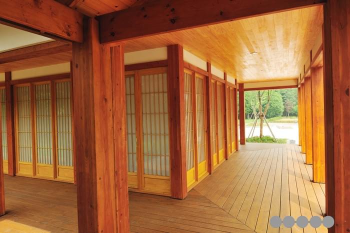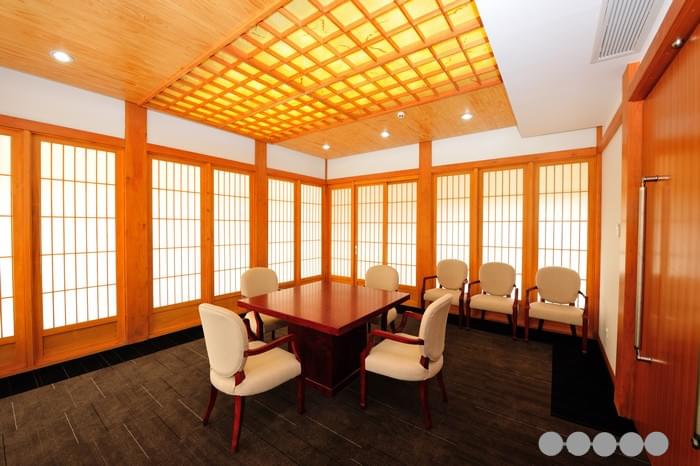 百花園日式木建筑四周有日式的圍廊和陽臺(tái),但采用的是花旗松膠合主柱和鐵杉防腐木地板。一樓和二樓均采用了大面積的和式移動(dòng)門窗,裝飾以日本進(jìn)口的幛子紙,透光而不透視,而所有日式門窗均采用溫潤細(xì)膩、耐腐抗變形的加拿大黃柏。循花旗松實(shí)木樓梯拾級(jí)而上,是日式茶室、辦公會(huì)客室、休息室和秘書室等功能區(qū)劃。整個(gè)室內(nèi)裝飾以針葉材實(shí)木板條和流白為主,地面是十分日本式的青石板,頂部的日式燈具均用直紋的花旗松實(shí)木在工廠定制而成。