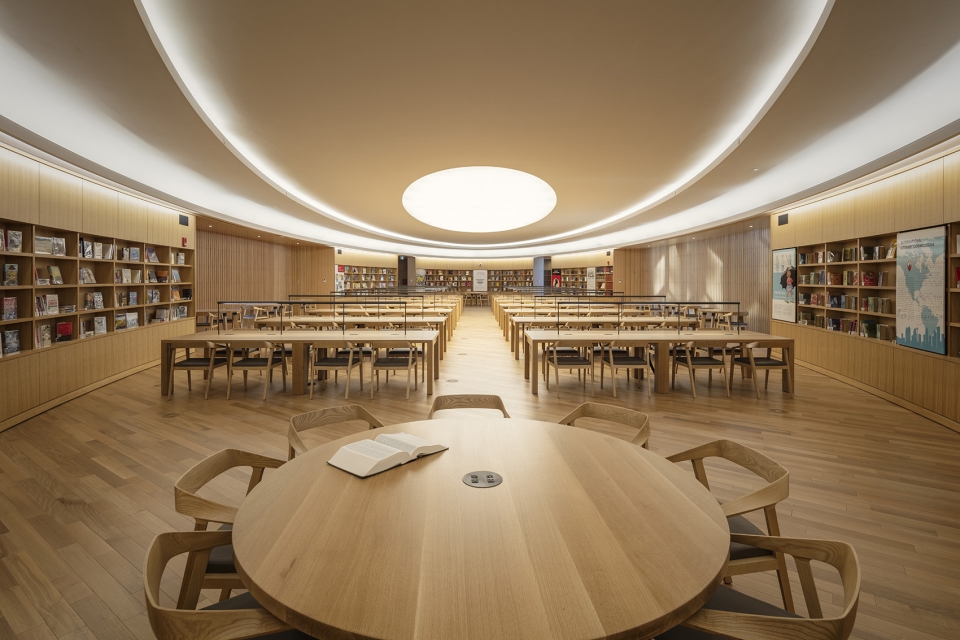 沿著拱門繼續(xù)走就走到了大廳和中庭,木質(zhì)樓梯蜿蜒而上,最高處距離地面有85英尺,通過(guò)巨大的“天眼”可以看到天空的景象。木質(zhì)格柵沿著開(kāi)放式中庭的邊緣排列,從平面上看像是一個(gè)尖尖的橢圓,這樣布置可以讓人們能很快就明白圖書(shū)館的組織流線。圖書(shū)館內(nèi)部使用的混凝土是外露的,且不加任何修飾,隱喻著室內(nèi)空間的自由性。梁和柱的排列方式讓人聯(lián)想到古希臘建筑中用來(lái)聚會(huì)和知識(shí)交流的拱廊。保留材料的原始性,就是為了讓人們感覺(jué)到這個(gè)圖書(shū)館是一個(gè)大家能夠參與進(jìn)來(lái)的地方,而不是一個(gè)神圣的藏書(shū)閣。