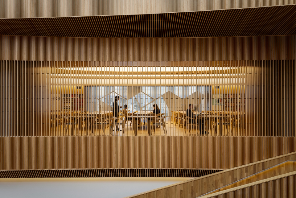 圖書(shū)館共有六層,分布著各種空間,比如數(shù)字空間,模擬空間,群體空間以及個(gè)人互動(dòng)空間。圖書(shū)館頂層是大閱覽室,建筑師在設(shè)計(jì)時(shí),把它構(gòu)想成藏在圖書(shū)館的珠寶盒,人們可以在這兒潛心研究,尋找靈感。進(jìn)入大閱覽室之前要先經(jīng)過(guò)一個(gè)過(guò)渡空間,過(guò)渡空間光線柔和,聲效優(yōu)良。室內(nèi)利用木質(zhì)格柵而非實(shí)體墻壁來(lái)環(huán)繞空間,這樣既保證了隱私,又有一定的可見(jiàn)度。陽(yáng)光透過(guò)木條的縫隙照亮了中庭和西立面之間的空間。