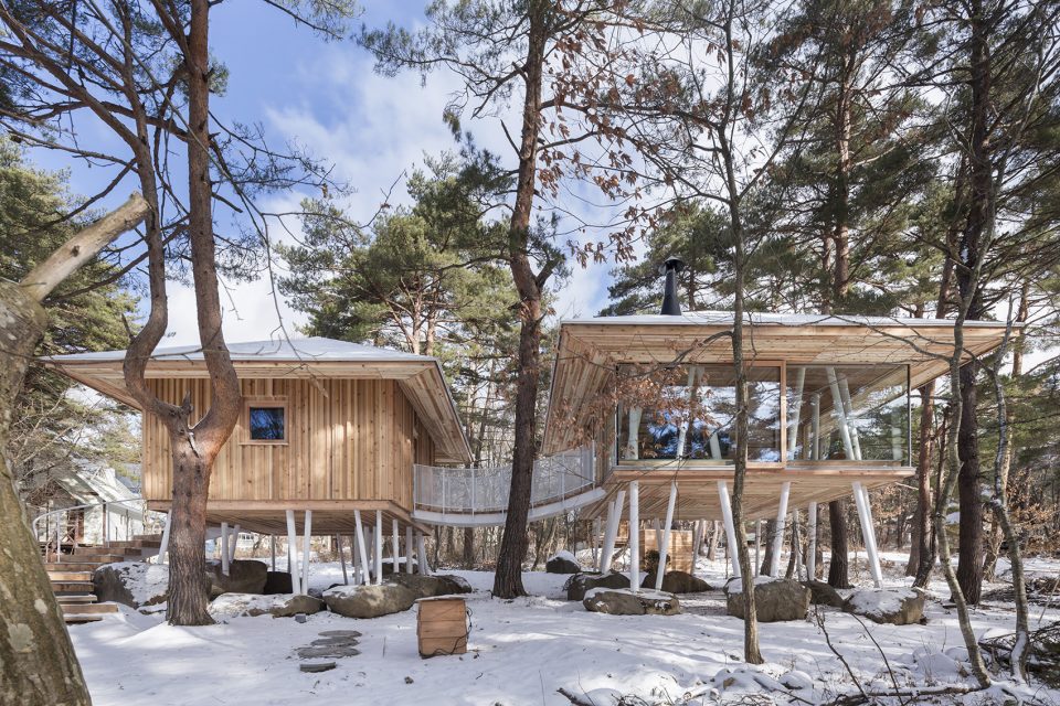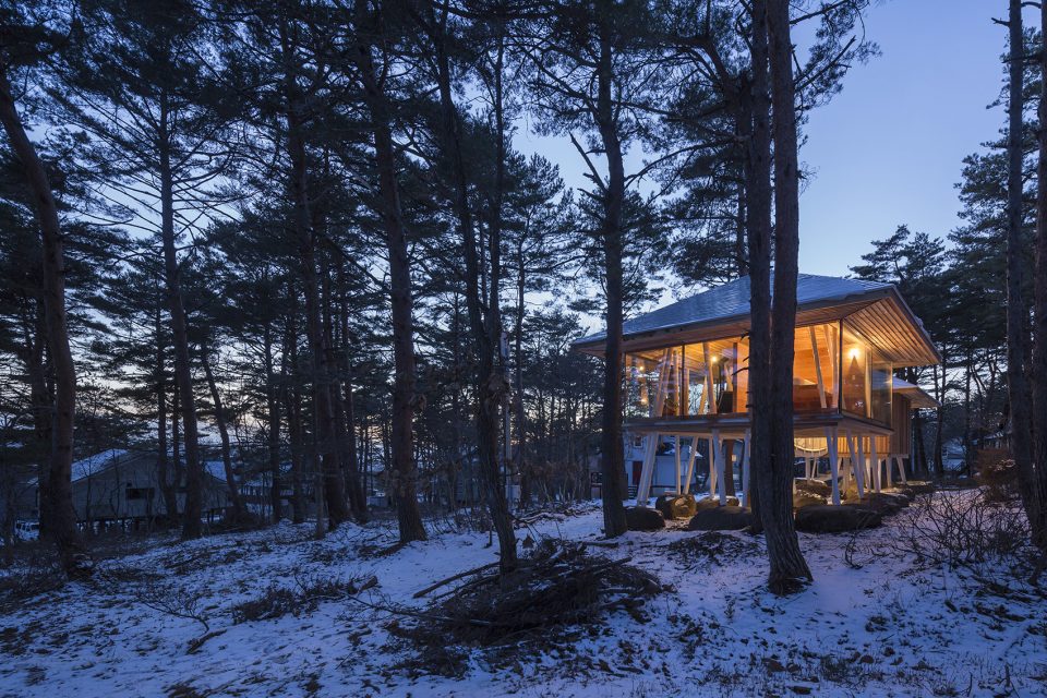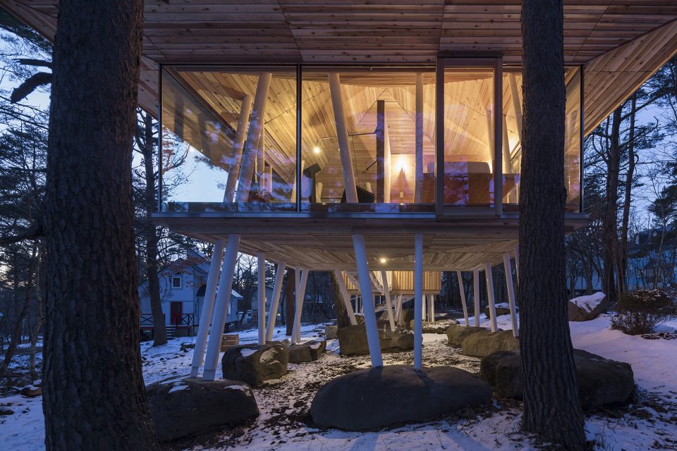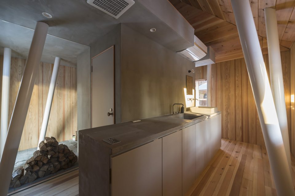 該地區(qū)常遇大雪天氣,因此建筑師利用架高的結(jié)構(gòu)為建筑賦予了2米多的雪荷載,以保證房屋不受大雪的破壞。住宅擁有兩個(gè)體量,分別容納了起居功能和生活用水功能。這兩個(gè)體量通過(guò)一座橋形成連接,使居住者能夠在橋上充分享受自然環(huán)境帶來(lái)的感官刺激。