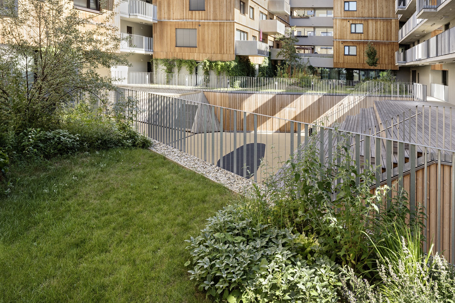 被稱為 "峽谷 "的地方,是一個位于建筑群中心的有幾處水平變化和座位臺階的區(qū)域,為所有居民提供了一個在那里聚會和體驗社區(qū)的機(jī)會。它是一個邂逅空間,也是年輕人的游戲區(qū)。在一些地方,坡道墻壁上的木質(zhì)覆層從墻壁中生長出來,形成傾斜的表面,供人們靠著或爬上去。大的水平面與墻體相連,形成了可以躺在上面或以不同方式使用的區(qū)域。