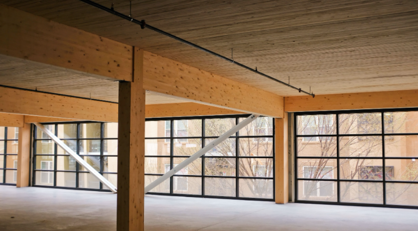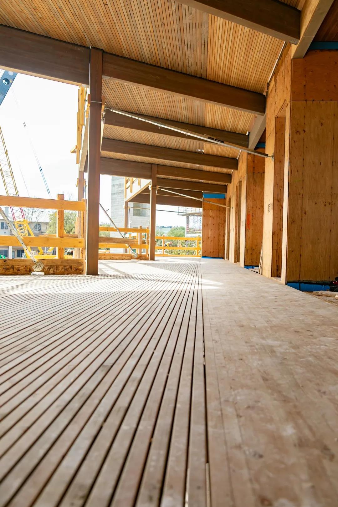 StructureCraft 在木材和材料工程方面擁有非常專業(yè)的知識,結(jié)構(gòu)工程團隊將內(nèi)部 SPF 、DLT 面板用到木質(zhì)走道的設(shè)計中,膠合木梁柱支撐了樓板。