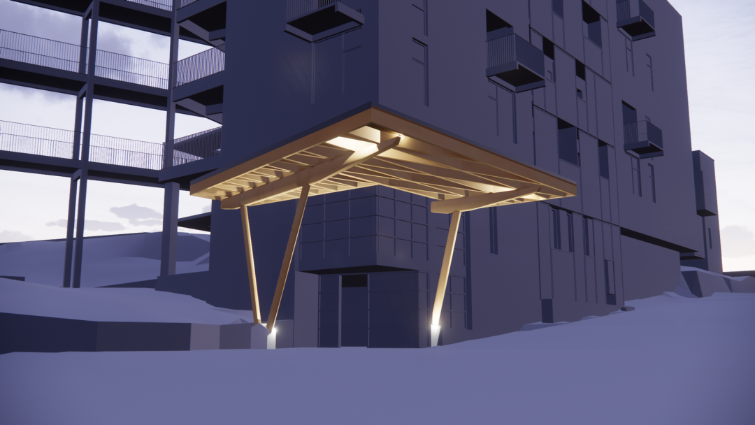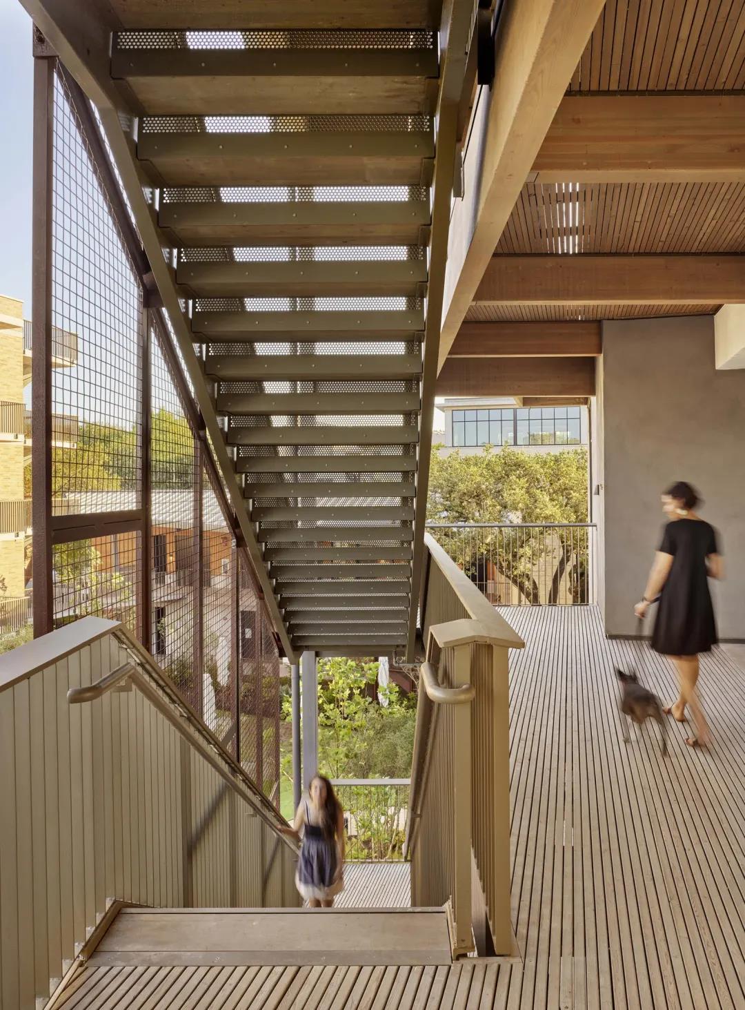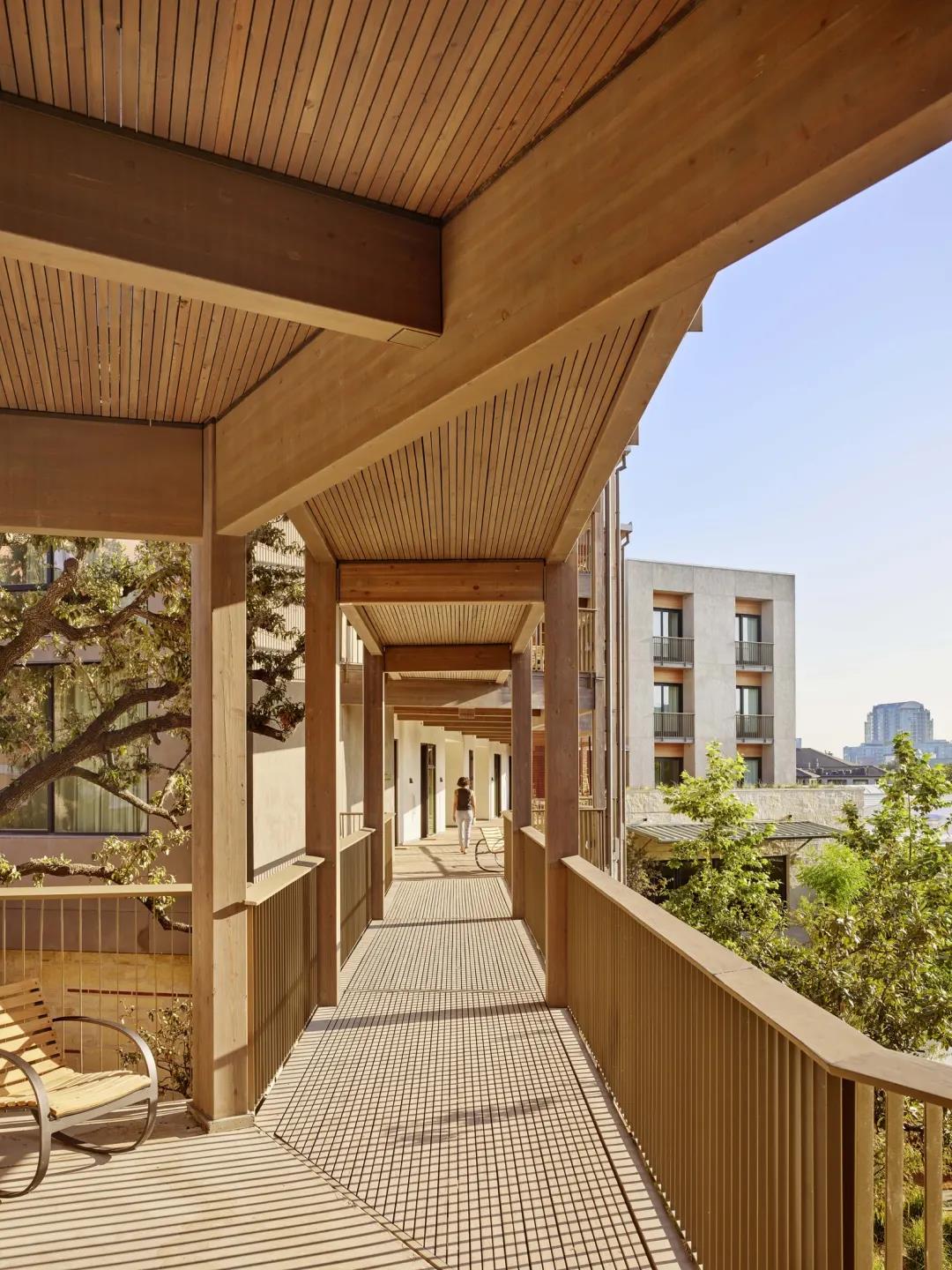 除此之外,還有其他幾處使用了定制的木結(jié)構(gòu)建筑構(gòu)件,其中包括 DLT 電梯和樓梯井、懸掛式陽臺、樓梯以及入口處的獨立門廊。