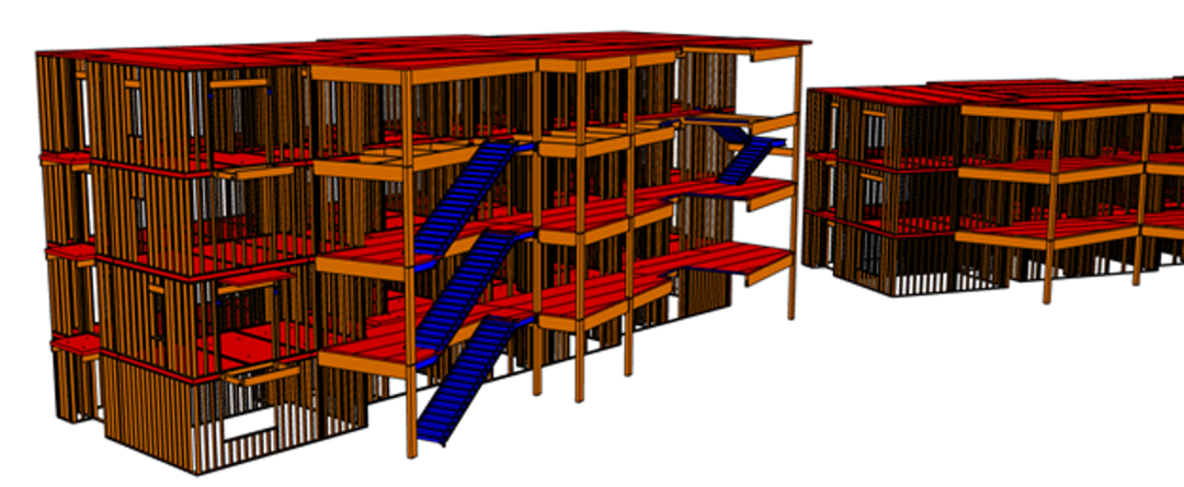 考慮到這些建筑物的墻體、形狀和輪廓都很復(fù)雜。設(shè)計時對每一面墻都進行了建模,并將它們預(yù)制化,以便后期快速安裝。團隊在電梯和出口樓梯處還使用了 DLT 豎井壁,這樣可以實現(xiàn)極快的安裝,同時還可以顯露木材。