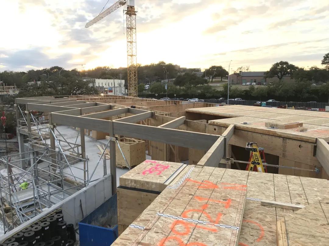 聲學(xué)設(shè)計也是早期設(shè)計階段的一個關(guān)鍵考慮因素。為了滿足 STC/IIC 等級,在 DLT 面板上放置了隔音墊以及鋪設(shè)了3 英寸的混凝土層。為了打造良好的居住環(huán)境,設(shè)計團隊為了減少側(cè)翼噪音,在立柱墻內(nèi)安裝了隔音條。