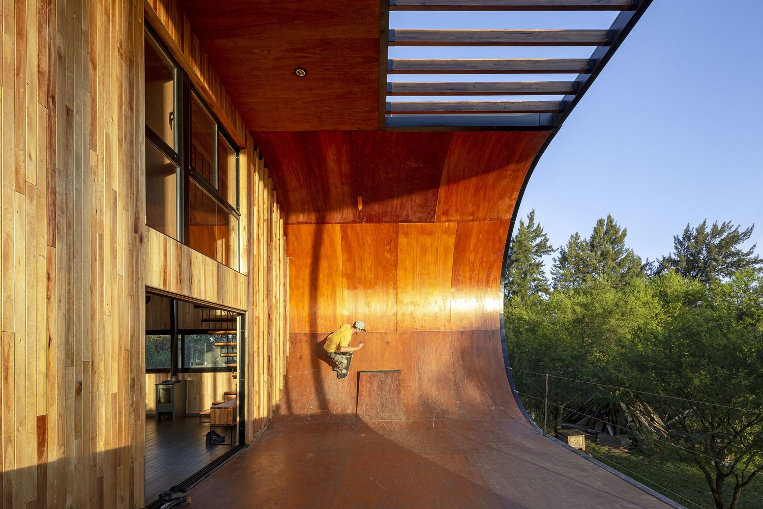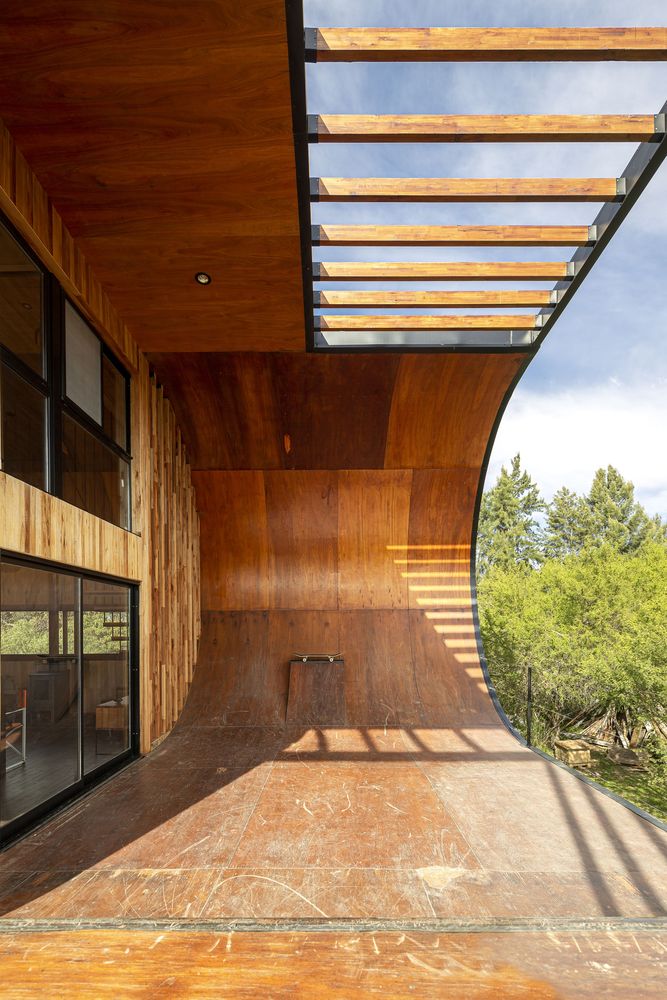 這是一個(gè)100%可持續(xù)的住宅,同時(shí)業(yè)主也可以在上面滑滑板。業(yè)主是一名滑板者,希望房子本身附帶一個(gè)滑板場地。設(shè)計(jì)師將室外陽臺設(shè)計(jì)成滑道,并在向南一側(cè)設(shè)置一面墻,在住宅東南角形成一個(gè)向上的弧形用于減速。這面墻延伸到了屋檐處,起到阻擋夏天烈日的作用。