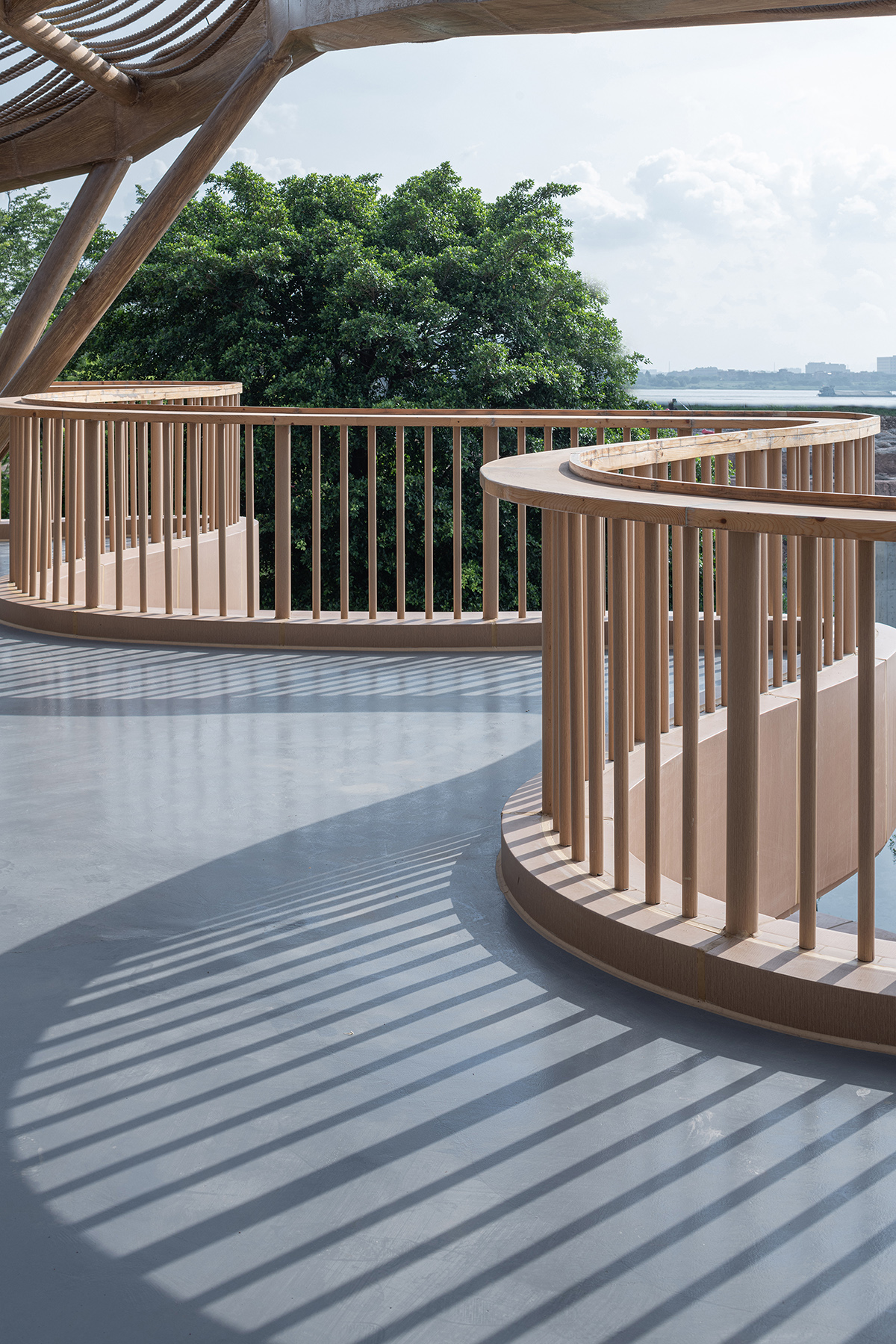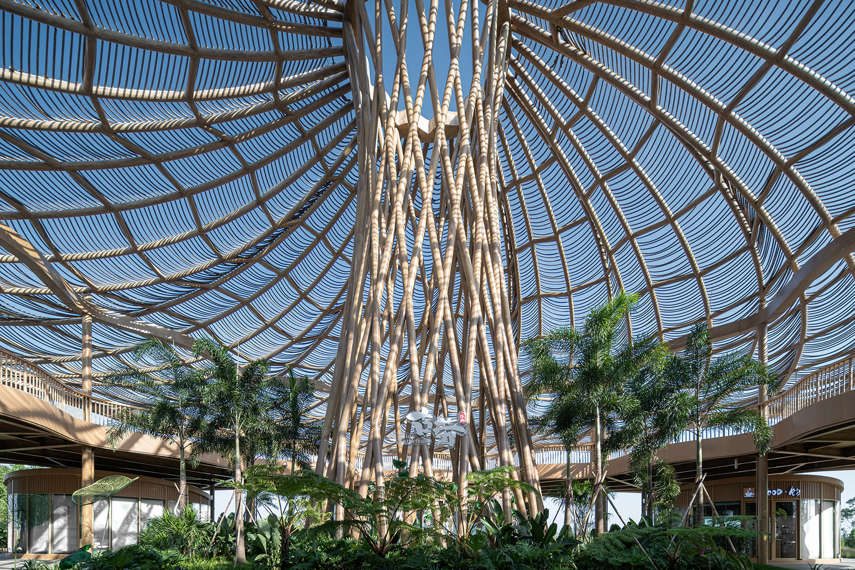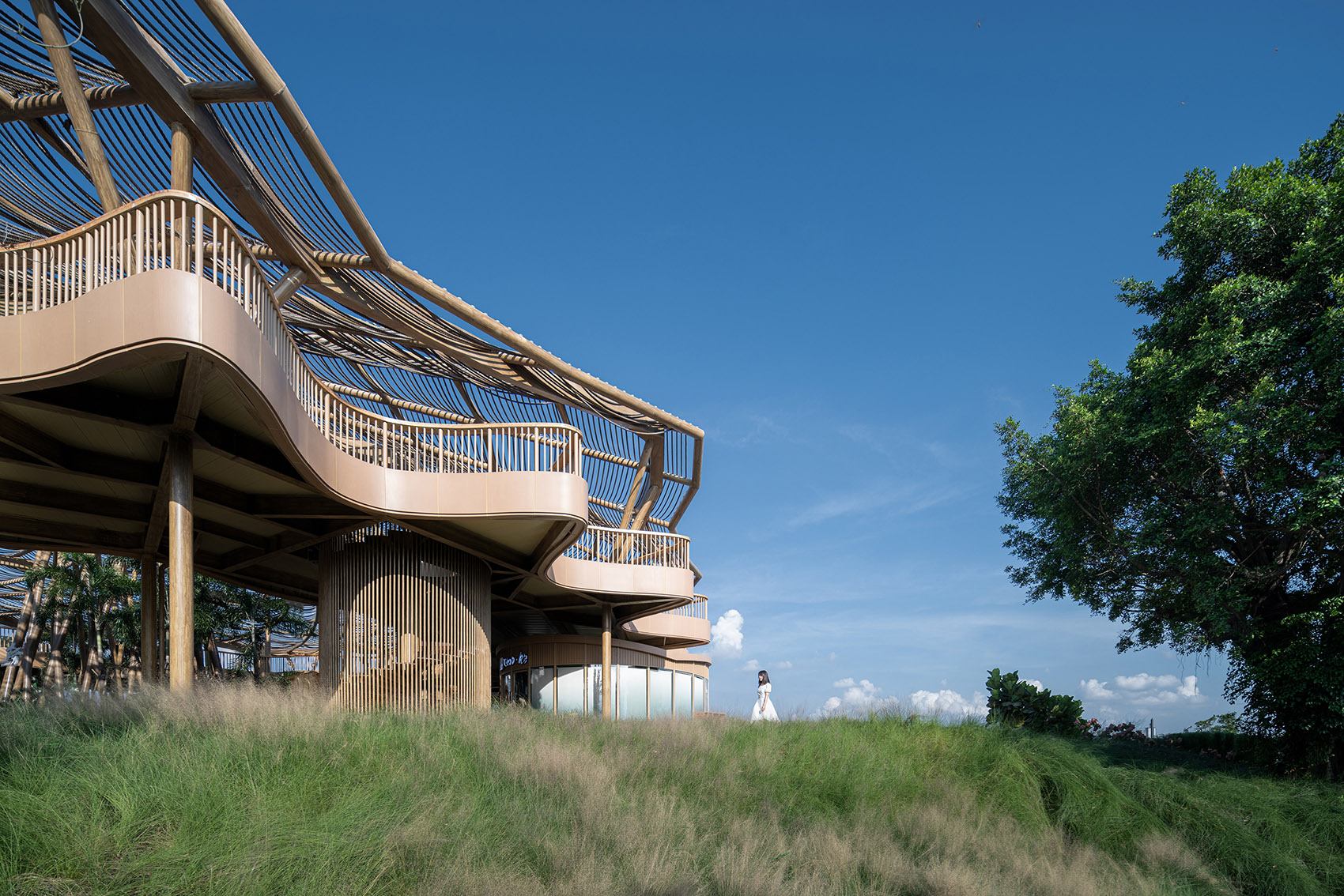 屋頂采用當(dāng)?shù)靥烊徊牧下槔K遮陽,在保證了整體建筑完整性的同時,將地域生態(tài)的材料用現(xiàn)代懸掛的形式呈現(xiàn),提升了屋頂觀覽區(qū)的觀賞性,使整個建筑也成為了一道靚麗的風(fēng)景線。